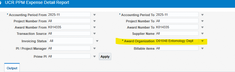 The UCR PPM Expense Detail Report requires a Department code in the Award Organization field. Using an Activity code will result in an error when running the report. |
